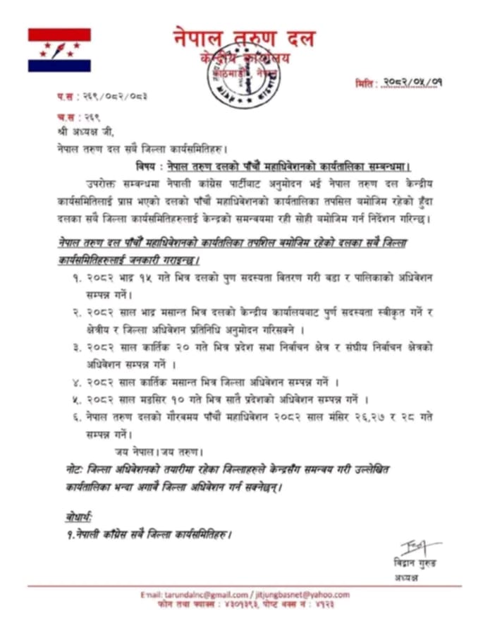 तरुण दलका अध्यक्ष विद्धान गुरुड.ले सार्वजनिक गर्नुभएको विज्ञप्ति अनुसार भाद्र १५ गतेभित्र पूर्ण सदस्उता वितरण गरि पालिकादेखि वडासम्मको अधिवेशन गरिनेछ । यस्तै भाद्र मसान्तभित्र केन्द्रीय कार्यालयबाट पूर्ण सदस्उता स्वीकृत गर्ने र क्षेत्रीय र जिल्ला अधिवेशन प्रतिनिधि अनुमोदन गरिसक्ने भनिएको छ । २०८२ कात्तिक २० गतेभित्र प्रदेशसभा निर्वाचन क्षेत्र र संघीय निर्वाचन क्षेत्रको अधिवेशन सम्पनन गरिसक्ने,२०८२ सालको कात्तिक मसान्तभित्र जिल्ला अधिवेशन सम्पन्न गर्ने कार्यतालिकामा उल्लेख गरिएको छ ।