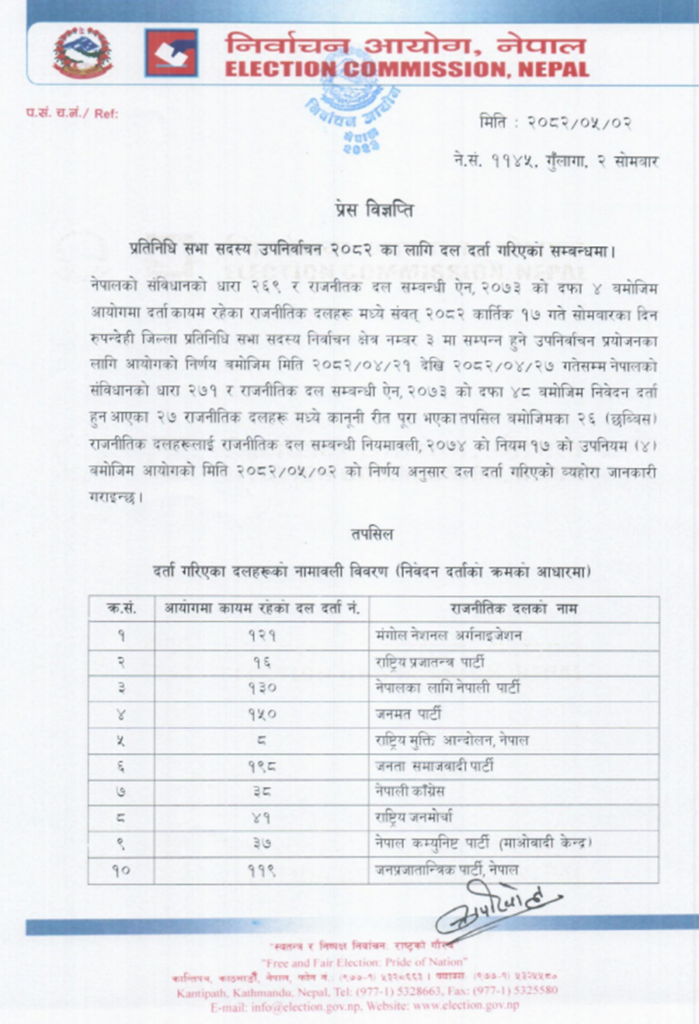 आयोग प्रवक्ता अर्यालका अनुसार नागरिक उन्मुक्ति पार्टी (नाउपा) ले आवश्यक कागजात पेस नगरेका कारण उपनिर्वाचनका लागि अयोग्य ठहर भएको छ ।
