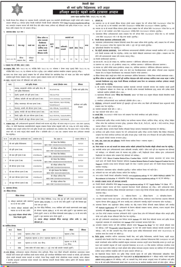 ६ भदौ, काठमाडौं । नेपाली सेनाले अधिकृत क्याडेट पदमा नयाँ भर्ना खुलाएको छ । भर्ना छनौट निर्देशनालयले आज सार्वजनिक गरेको सूचना अनुसार अधिकृत क्याडेट पदमा २८० जनाका लागि भर्ना खुलेको हो ।