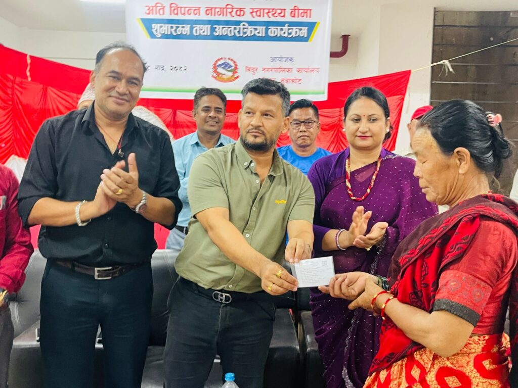 विदुर । नुवाकोट जिल्लाको विदुर नगरपालिकाले नगरभित्रका अति विपन्न परिवालाई स्वास्थ्य बिमामा समावेश गर्ने भएको छ । नगरपालिकाले नगरभित्रका अति विपन्न, दलित, सीमान्तकृत तथा आर्थिक–सामाजिक रूपमा कठिनाइमा परेका परिवारलाई लक्षित गर्दै सञ्चालन हुने “अति विपन्न नागरिक स्वास्थ्य बीमा कार्यक्रम” २०८२ को शुभारम्भ गरेको छ ।