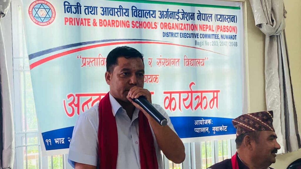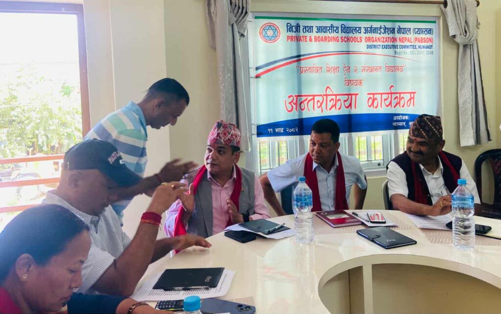 प्याब्सन तथा एन प्याब्सनको केन्द्रीय समितिका निर्णय अनुसार आज नुवाकोटमा प्रस्तावित शिक्षा ऐन र संस्थागत विद्यालयका चुनौतीहरु विषयक राजनीतिक दलका नेतृत्वसँग अन्तर्रक्रिया कार्यक्रम आयोजना गरेको थियो । नुवाकोट प्याब्सनका अध्यक्ष पुरुषोत्तम अधिकारीको सभापतित्वमा भएको कार्यक्रममा जिल्लामा क्रियाशिल राजनीतिक दलका नेता तथा वुद्धिजिविहरुले निजी विद्यालयहरुले उठाएका मागलाई शिक्षा विधेयकमा समेटिनुपर्नेमा जोड दिएका छन् ।