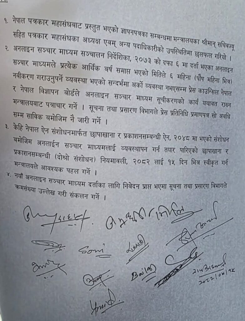 विभिन्न ४ बुँदामा भएको सहमति अनुसार बुँदा नं ३ मा केही नेपाल ऐन संशोधनमार्फत छापाखाना र प्रकाशन सम्बनिध ऐन,२०२८ मा भएको संशोधन बमोजिम अनलाइन सञ्चार माध्यमलाई व्यवस्था गर्न तयार पारिएको छापाखाना र प्रकाशन सम्बनिध (दोस्रो संशोध) नियमावली २०८२ लार्य १५ दिनभित्र स्वीकृत गर्न मन्त्रालयले आवश्यक पहल गर्ने उल्लेख गरिएको छ ।