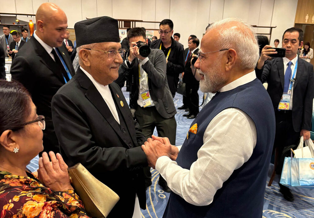 काठमाडौँ, भदौ १५ गते। चीन भ्रमणमा रहनुभएका प्रधानमन्त्री केपी शर्मा ओलीले थियानचिनमा भारतका प्रधानमन्त्री नरेन्द्र मोदीसँग भेटवार्ता गर्नुभएको छ।