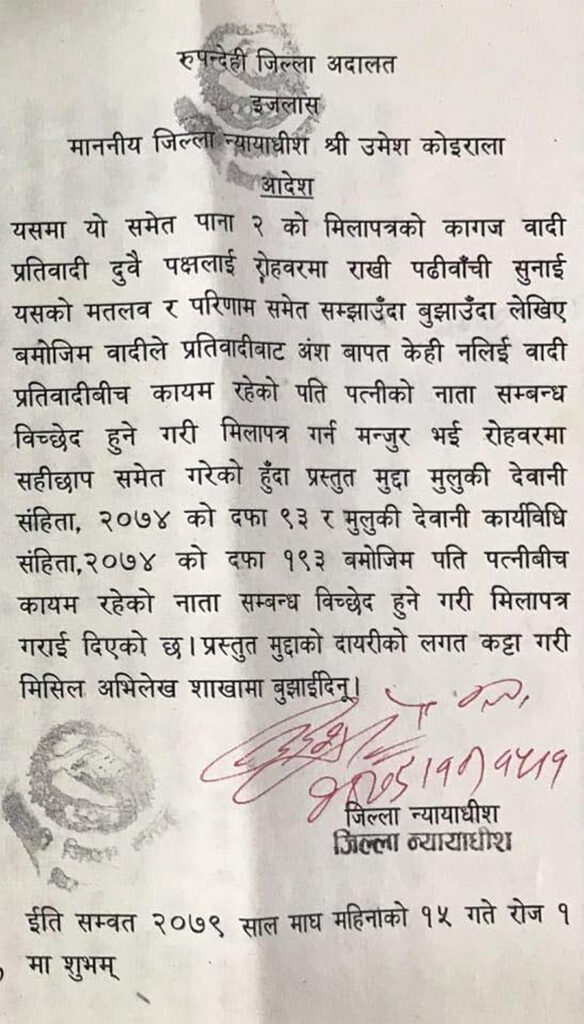 १७ भदौ, बुटवल । दुई श्रीमती भएको भन्दै चौतर्फी आलोचनकाबीच रुपन्देही क्षेत्रनम्बर ३ मा हुन लागेको उपनिर्वाचनमा राष्ट्रिय स्वतन्त्र पार्टी (रास्वपा) का उम्मेदवार डा. लेखजंग थापाले पहिलो श्रीमतीसँग डिभोर्स भइसकेको कागजात सार्वजनिक गरेका छन् ।