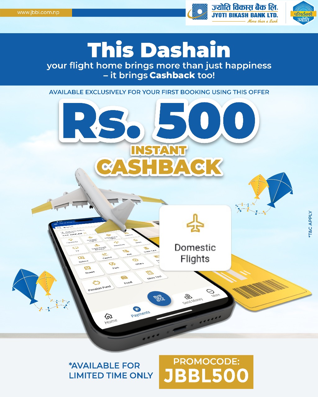 ज्योति विकास बैंकको मोबाईल बैंकिङ्ग App, ज्योति स्मार्टमार्फत हवाई टिकट खरिद गर्दा बैंकले रु. ५०० क्यासब्याक प्राप्त हुने योजना सार्वजनिक गरेको छ। दशैंको अवसरमा ग्राहकहरूलाई सहज र लाभदायक यात्राको सुविधा प्रदान गर्ने उद्देश्यले बैंकले यो अफर सार्वजनिक गरेको हो। यस योजनाअन्तर्गत, ग्राहकहरूले ज्योति स्मार्ट एप प्रयोग गरी जुनसुकै घरेलु एयरलाइन्सको हवाई टिकट खरिद गर्दा रु. ५०० सम्मको सर्वाधिक क्यासब्याक प्राप्त गर्न सक्नेछन्। ज्योति स्मार्ट App बाट हवाई टिकट खरिद गर्दा “JBBL500” प्रोमो कोड प्रयोग गरी उक्त क्यासब्याक सुविधाको लाभ उठाउन सकिन्छ। साथै, पहिलो ४०० जना मात्र यो अफरबाट लाभान्वित हुन सक्नेछन्।