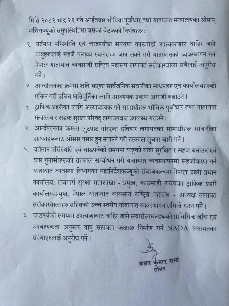 त्यस्तै, चाडपर्वका लागि उपत्यका छाड्ने सवारी साधनहरूको प्राविधिक जाँच गराउन र आवश्यकताअनुसार यात्रु सहायता कक्षहरू निर्माण गर्न नाडा लगायतका संस्थाहरूलाई अनुरोध गर्ने निर्णय समेत गरिएको छ।