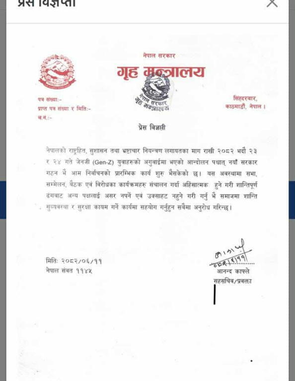 समाजमा शान्ति, सुव्यवस्था र सुरक्षा कायम गर्ने कार्यमा सहयोग गर्न समेत जारी विज्ञप्तिमार्फत अपिल गरेको गरिएकाे हाे।