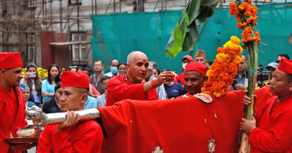 जमलबाट हनुमानढोकासम्म निजामती सेवाका उच्च पदस्थ अधिकारीहरू, गुर्जुका पल्टन, ब्याण्डबाजा, पञ्चेबाजा र सांस्कृतिक नाचगानसहितको लावालस्करका साथमा फूलपाती ल्याउने गरिन्छ।