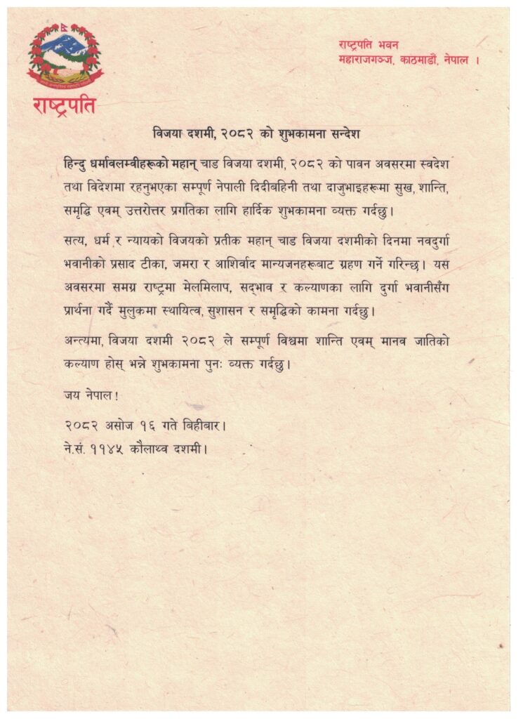 राष्ट्रपति पौडेलले बिहीबार ९२०८२ असोज १६ गते० शुभकामना सन्देश जारी गर्दै सम्पूर्ण नेपालीको सुख, शान्ति, समृद्धि एवम् उत्तरोत्तर प्रगतिका लागि कामना गरेका हुन् ।