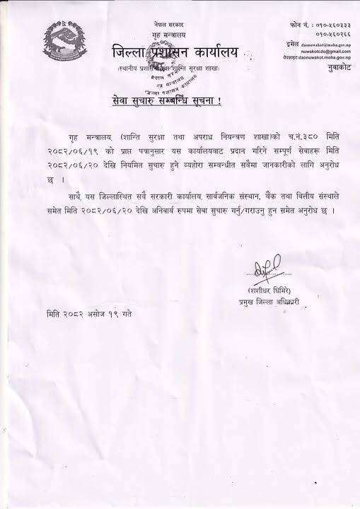 जिल्ला प्रशासन कार्यालय नुवाकोटका अनुसार विपद्को जोखिम नभएकाले कार्यालय सुचारु गर्न लागिएको हो ।प्रमुख जिल्ला अधिकारी शशीघर घिमिरेले एक सूचना जारी गर्दै जिल्ला भित्रका सबै सरकारी , गैरसरकारी तथा संघ संस्थाका कार्यालय आजबाट सञ्चालनका लागि सूचना जारी गर्नुभएको छ ।