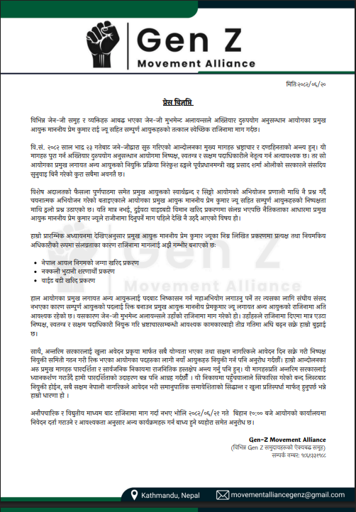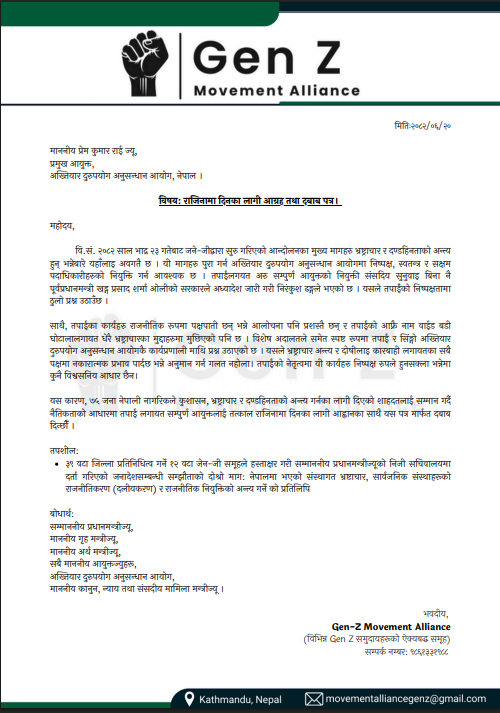 जेनजी अलाइन्सले लिखित रुपमा दर्ता गराएको माग–