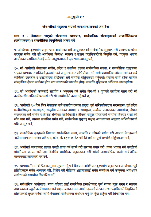 त्यस्तै, नीतिगत भ्रष्टाचारको सम्बोधनलाई कानुनमा आवश्यक संशोधनको आवश्यक सिफारिस गर्ने, संविधानको संशोधन गर्नुपर्ने बुँदा तर्जुमा गरी सिफारिसको मागसमेत जेनजी अलाइन्सको छ ।